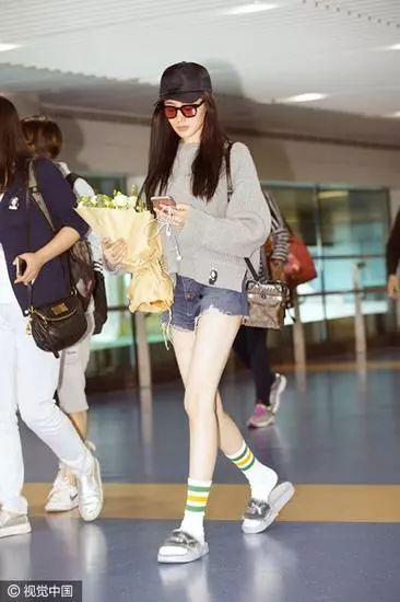 杨幂是时尚界的代表人物之一,她的穿搭风格多变。有一次,杨幂在机场被拍到穿着一双黑色网袜,与黑色短裤搭配,展现出性感的一面。